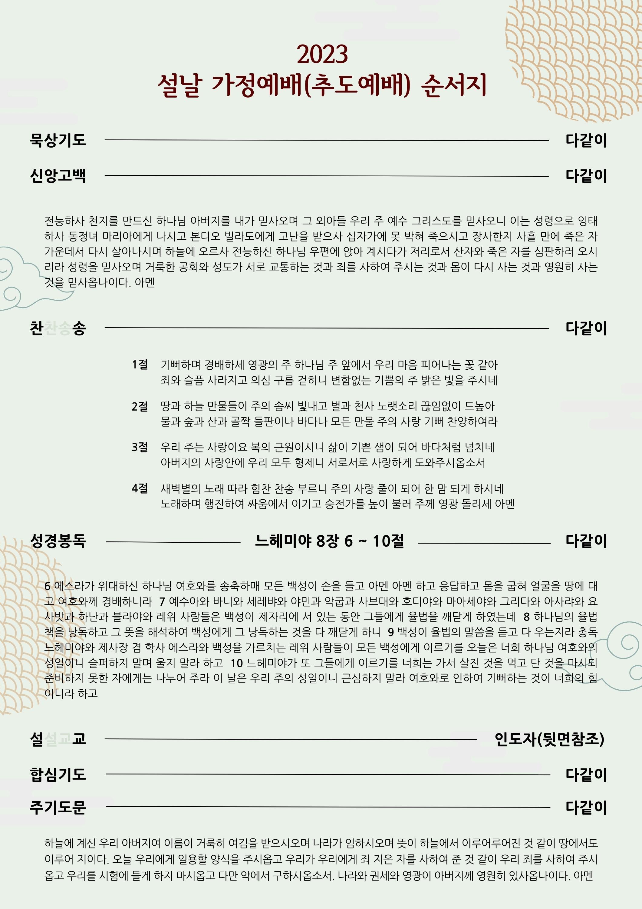 설 명절을 맞아 가족, 친척들과 함께 예배하는 시간이 되기를 소망합니다.
