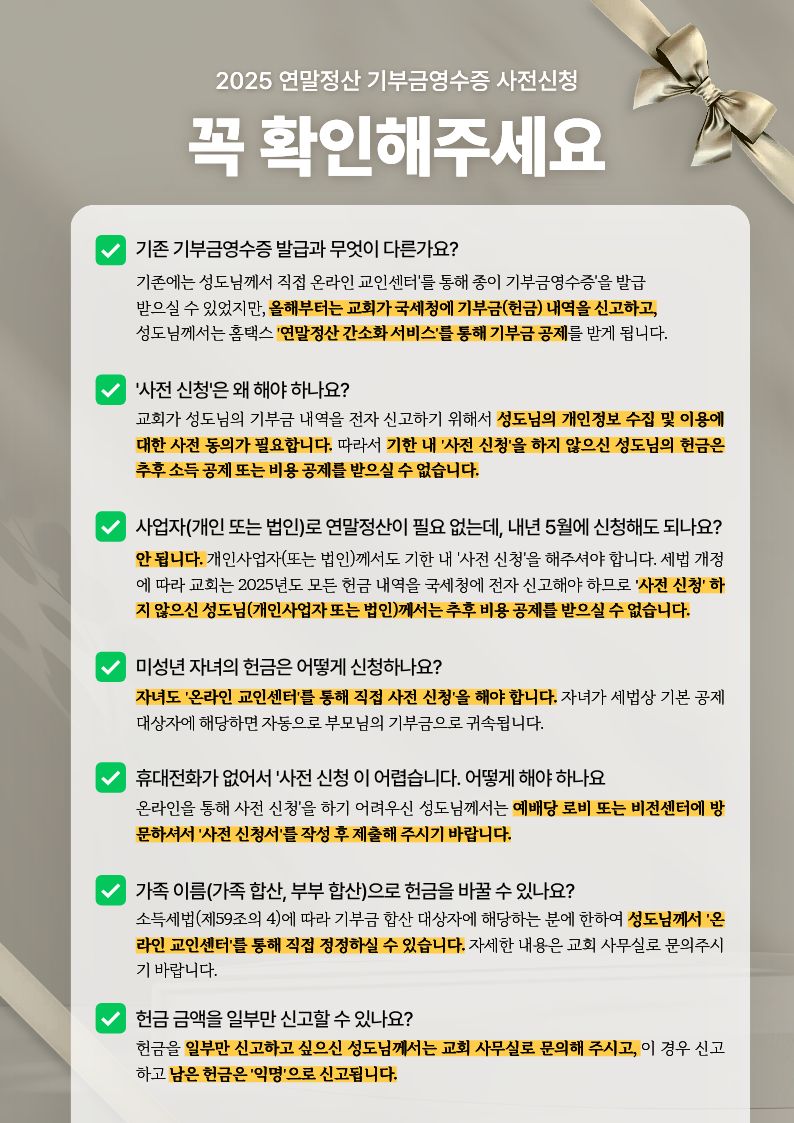 * 기한 내 '사전 신청'을 하지 않은 성도님의 헌금은 추후 소득 공제 또는 비용 공제를 받으실 수 없습니다.