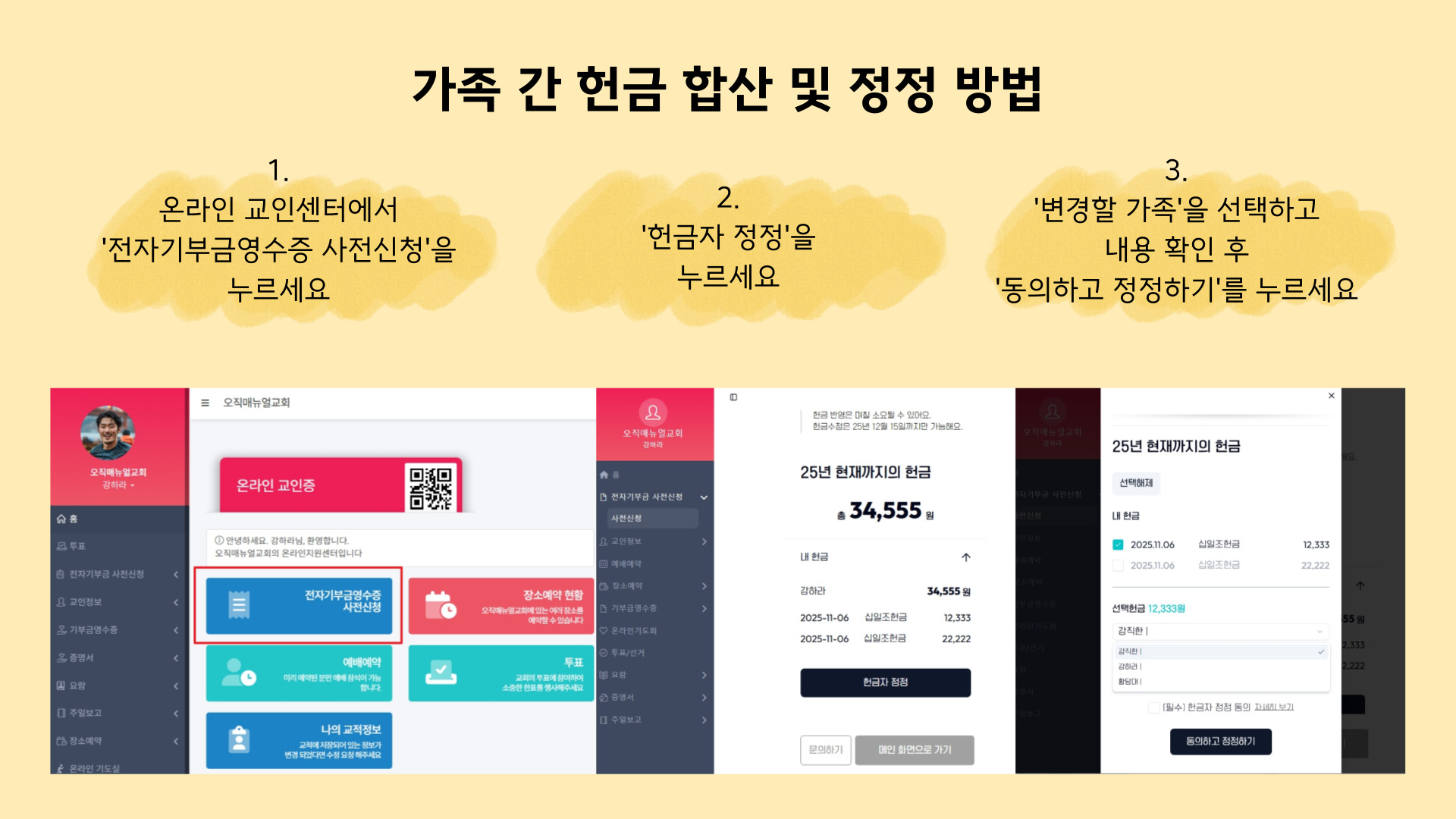 ※ 가족 간 헌금 합산은 성도 본인의 동의 및 직접 정정을 통해서만 가능하며, 교회에서는 임의로 헌금 명의를 변경하거나 합산 처리할 수 없습니다.