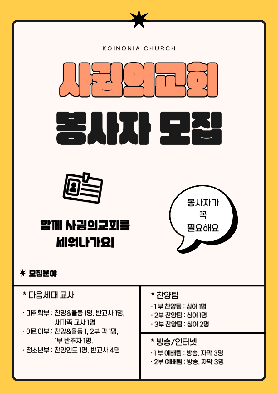 2024년 사귐의교회를 아름답게 세워갈 봉사자(주일학교 교사)를 모집합니다.
